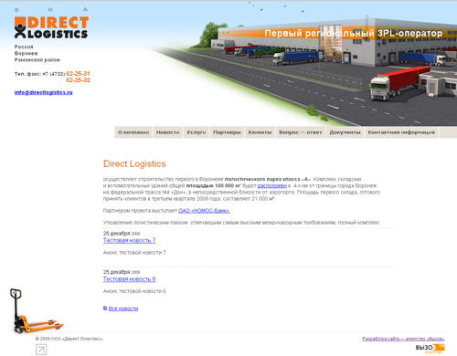 Логистический парк класса А в Воронеже. Был разработан динамический сайт, включающий всю основную информацию по услугам компании, словарь логистических терминов, перечень часто задаваемых вопросов и удобную схему проезда. В шапке сайта была реализована флеш-анимация, показывающая работу склада изнутри.